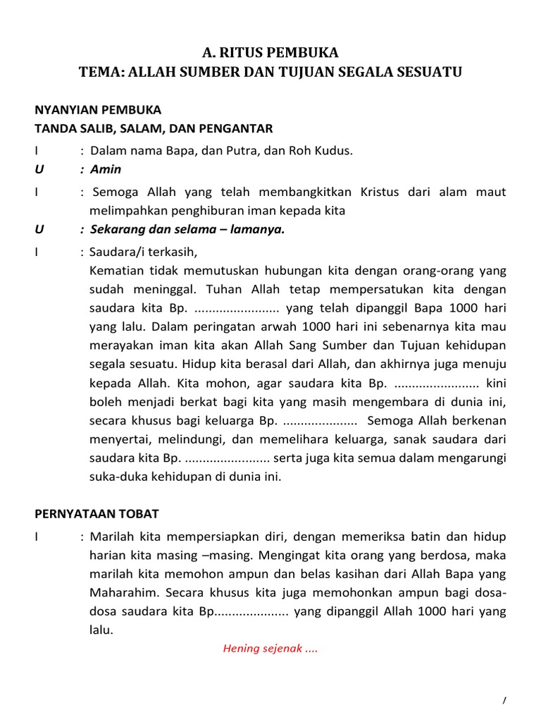 Saudara-saudari yang terkasih dengan seluruh hati dan budi marilah kita pada peringatan 7 hari almarhum NN di panggil Bapa di surga kita bersama- sama berdoa memohon.